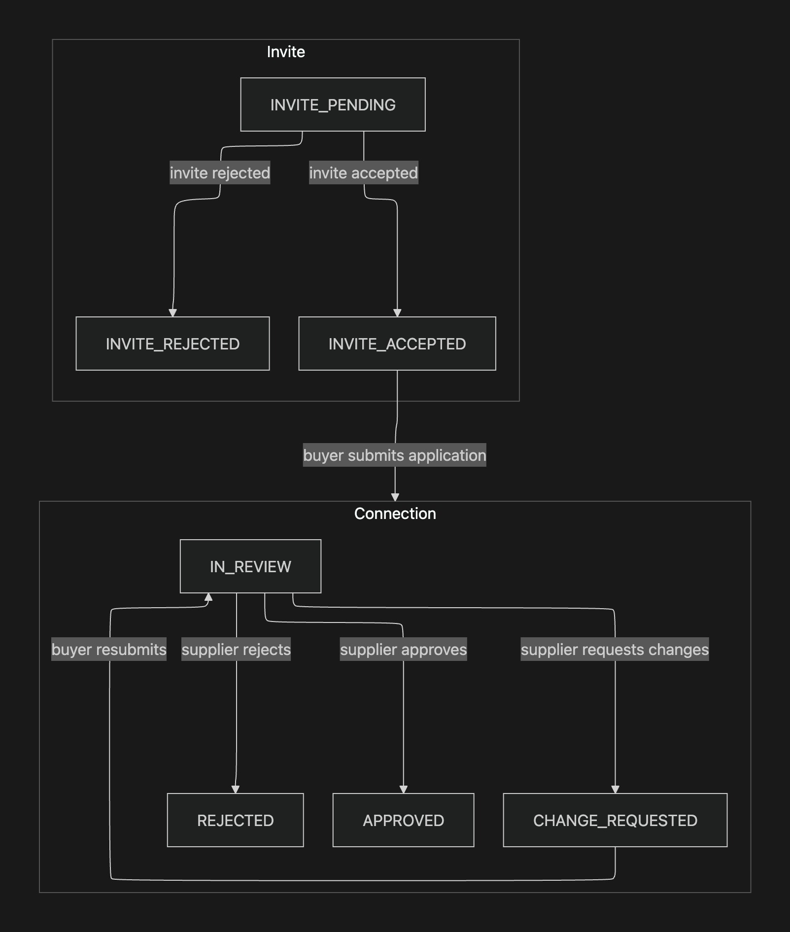 The design worked internally for all use cases, but didn’t map cleanly to the typical Nuvo user’s mental model. The core user persona is a credit manager working through an accounts receivable workflow—checking new applications and conducting recurring reviews across existing approved accounts. As a result, we had to map various internal states to friendlier display states on the frontend (masking the concepts of “invites” and “connections” entirely). With new accounts payable users entering the platform to onboard as vendors, we foresaw this problem getting worse.